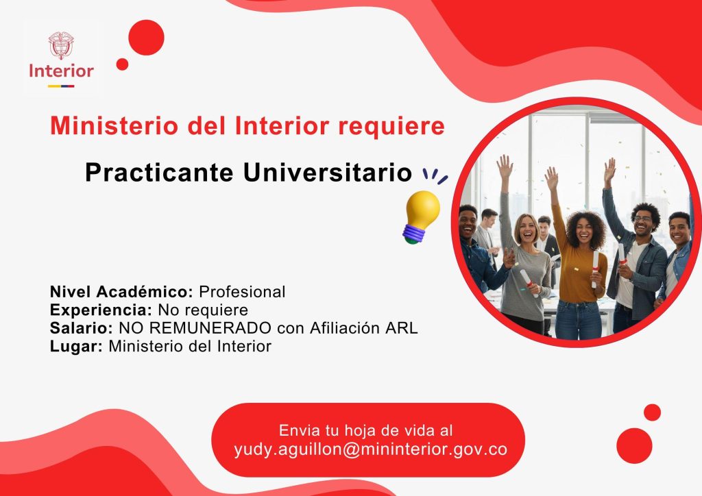 El Ministerio del Interior se encuentra en b煤squeda de estudiantes que se encuentren en etapa de pr谩ctica y deseen fortalecer sus competencias profesionales en un entorno din谩mico, aplicando los conocimientos adquiridos durante su proceso de formaci贸n y aportando valor a su equipo de trabajo.