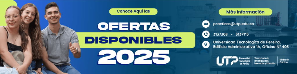| Enero | UNIVERSIDAD TECNOLOGICA DE PEREIRA | PRACTICANTE LABORATORIOS FACULTAD BELLAS ARTES – ING. INDUSTRIAL | INGENIERIA INDUSTRIAL | Ver más | Ir a solicitar entrevista |
