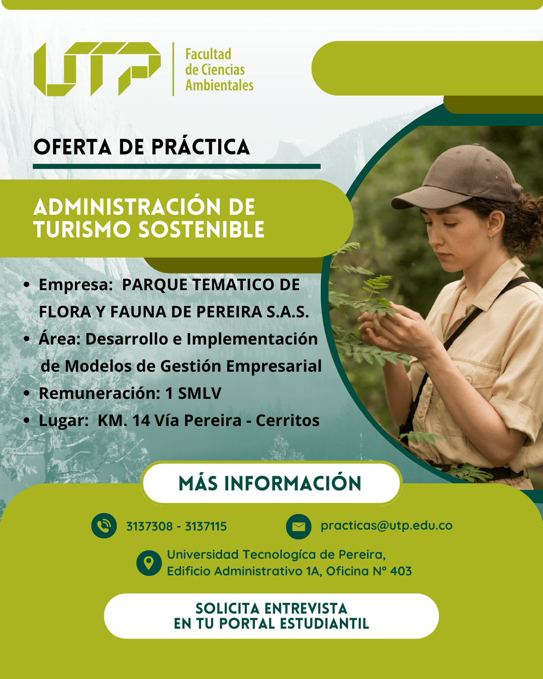 | Noviembre | PARQUE TEMATICO DE FLORA Y FAUNA DE PEREIRA S.A.S. | PRACTICANTE DE ADMINISTRACIÓN DEL TURISMO SOSTENIBLE | ADMINISTRACIÓN DEL TURISMO SOSTENIBLE | Ver más | Ir a solicitar entrevista |
