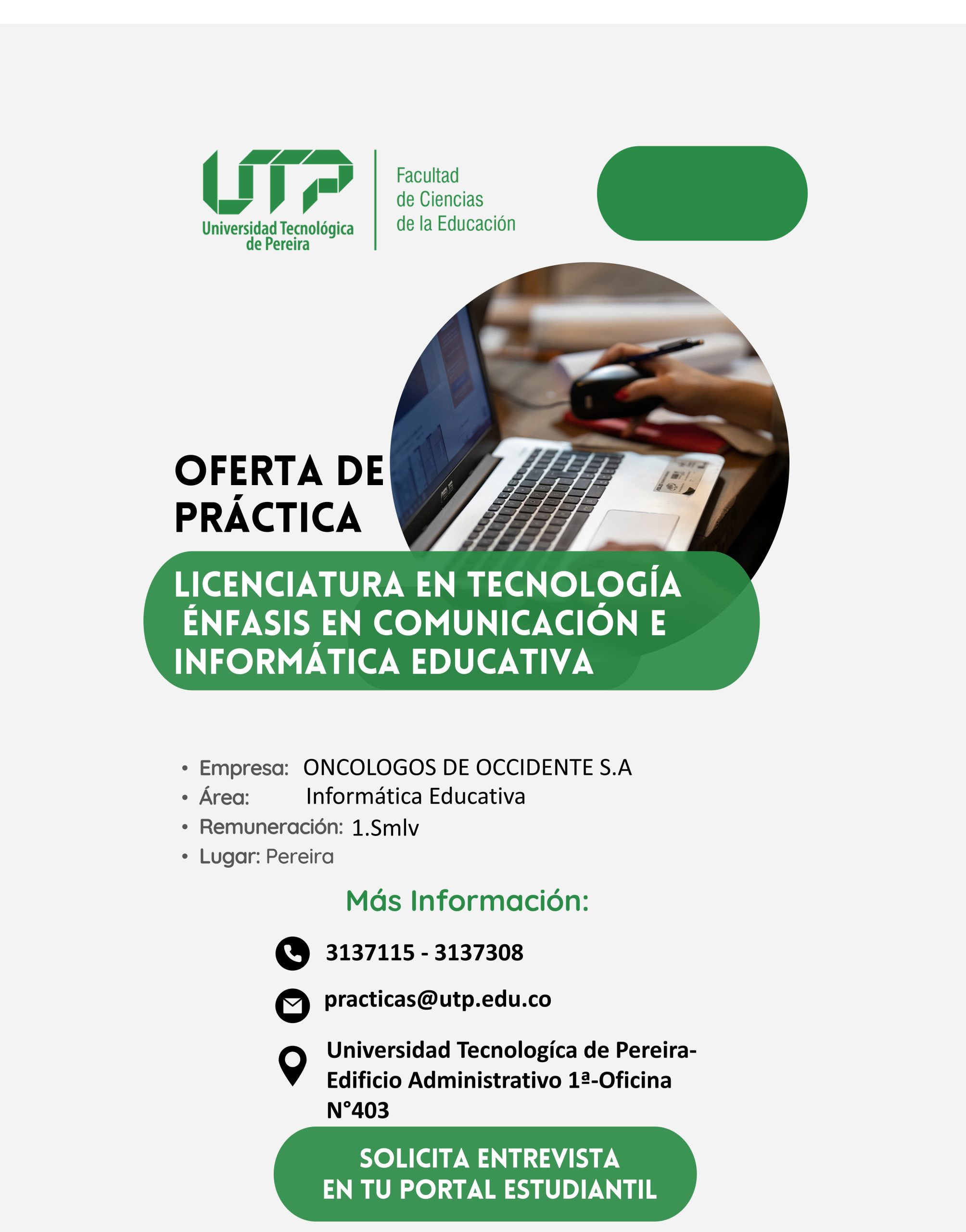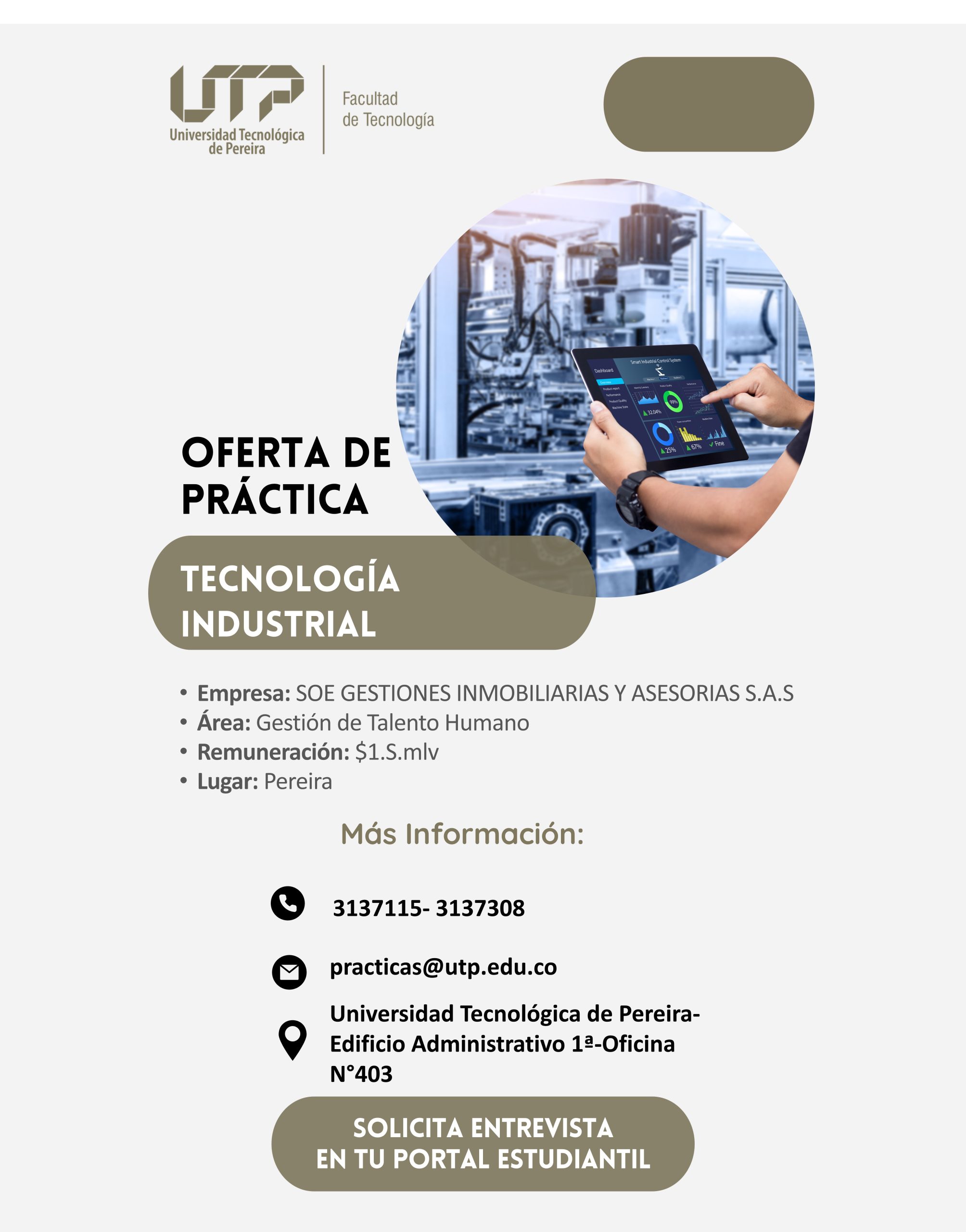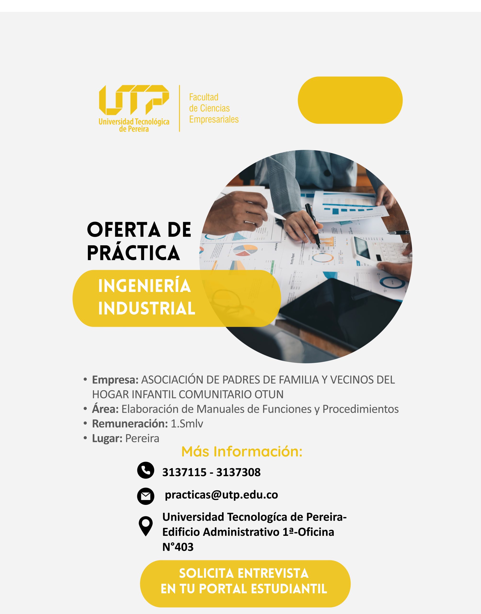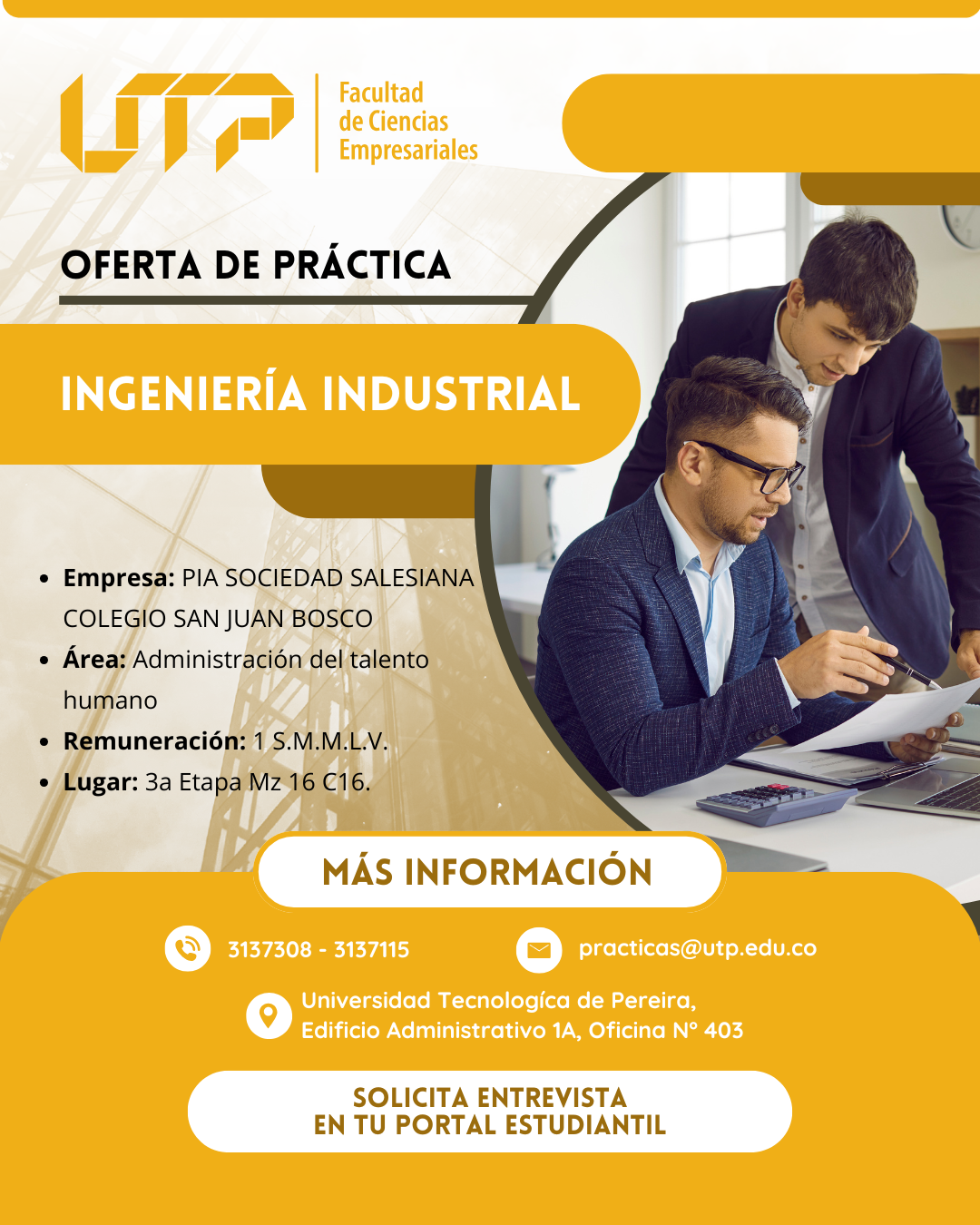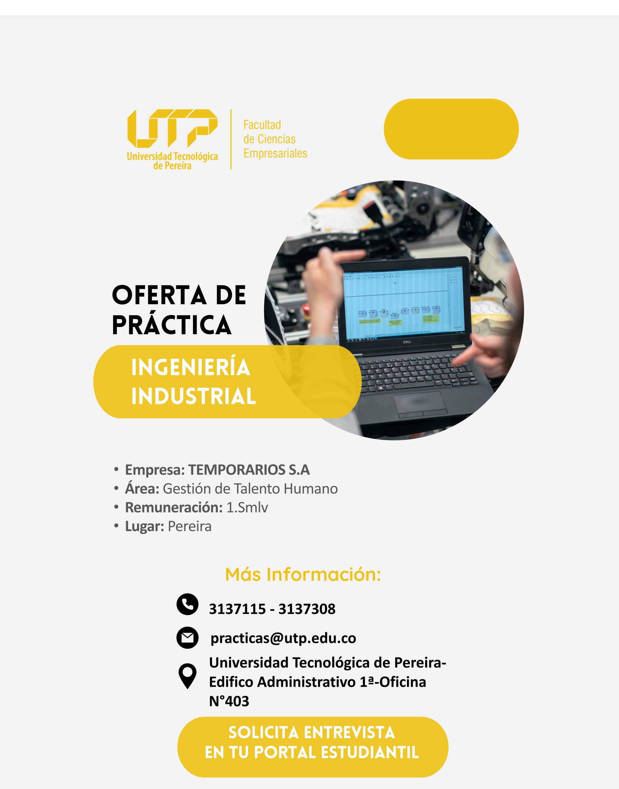 Enero | UNIVERSIDAD TECNOLOGICA DE PEREIRA | PRACTICANTE LABORATORIOS FACULTAD BELLAS ARTES – ING. INDUSTRIAL | INGENIERIA INDUSTRIAL | Ver más | Ir a solicitar entrevista |