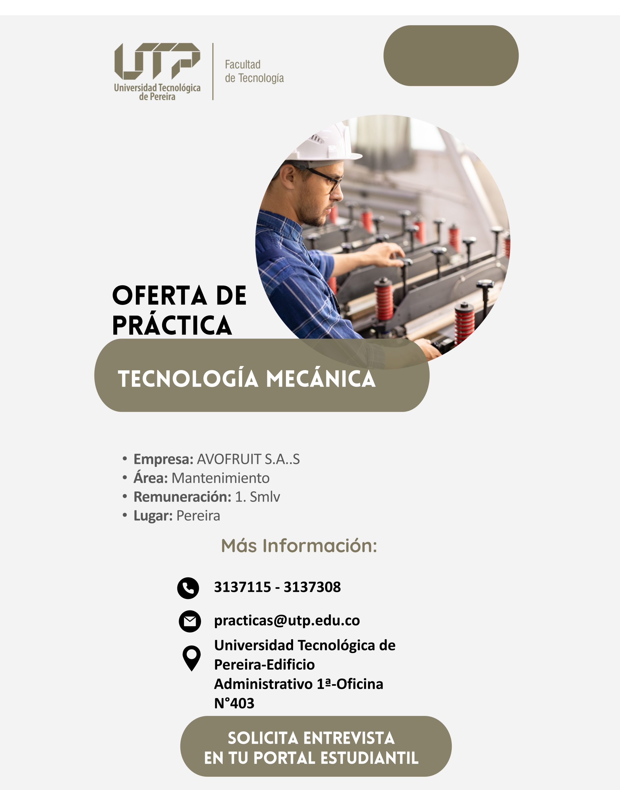 Septiembre | AVOFRUIT S.A.S | PRACTICANTE DE MANTENIMIENTO | TECNOLOGIA MECANICA | Ver más | Ir a solicitar entrevista |
