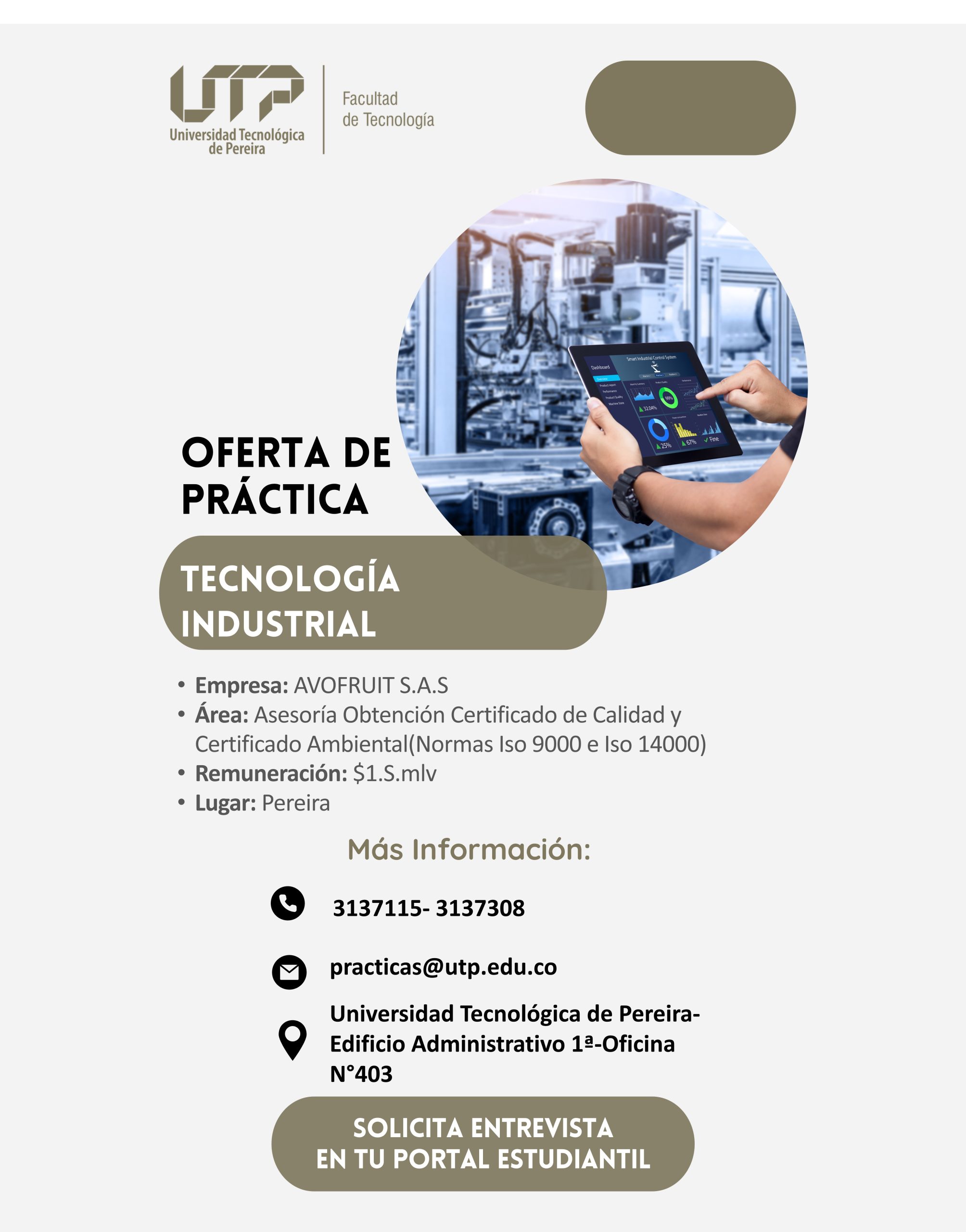 Agosto | AVOFRUIT S.A.S | PRACTICANTE MEJORAMIENTO CONTINUO | TECNOLOGIA INDUSTRIAL | Ver más | Ir a solicitar entrevista |