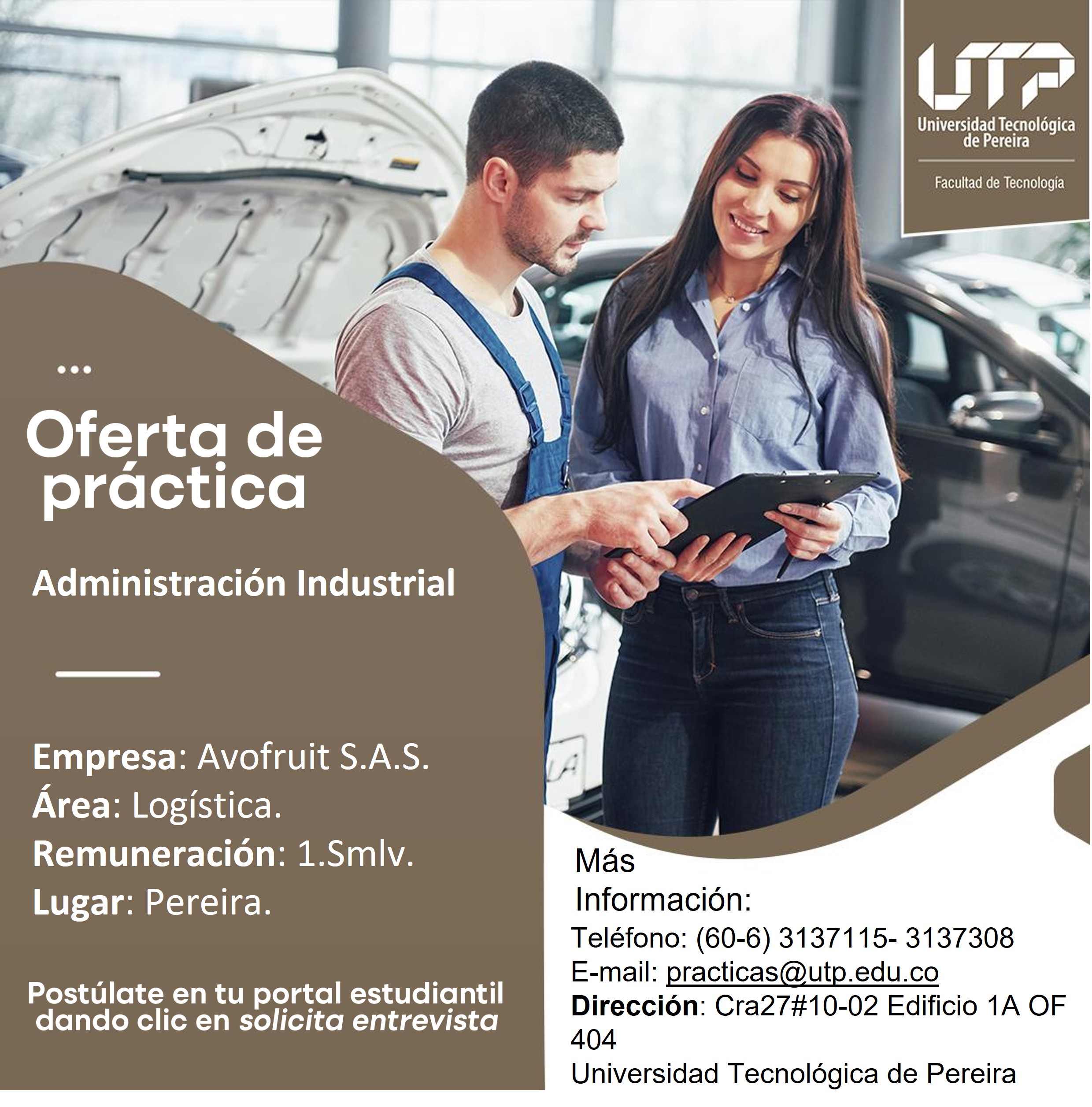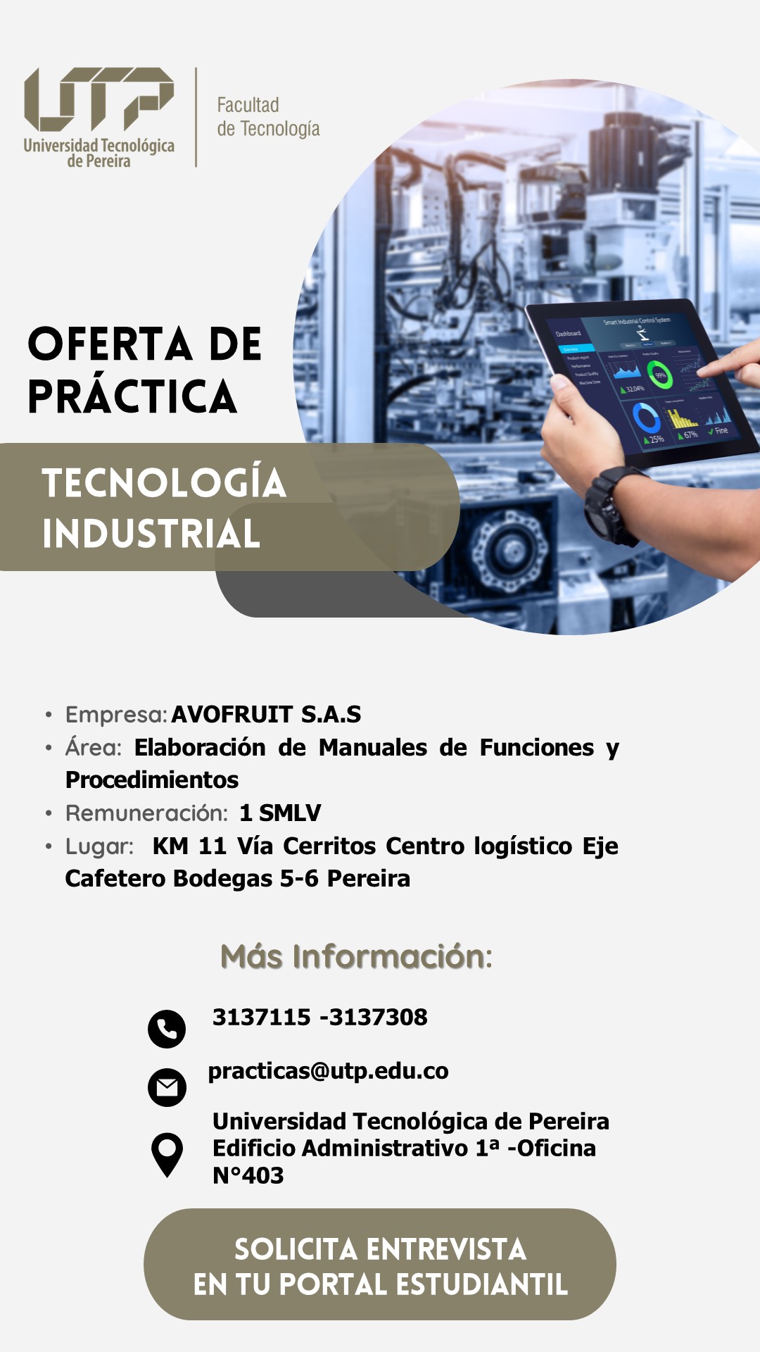 | Octubre | AVOFRUIT S.A.S | PRACTICANTE TALENTO HUMANO | TECNOLOGÍA INDUSTRIAL | Ver más | Ir a solicitar entrevista |