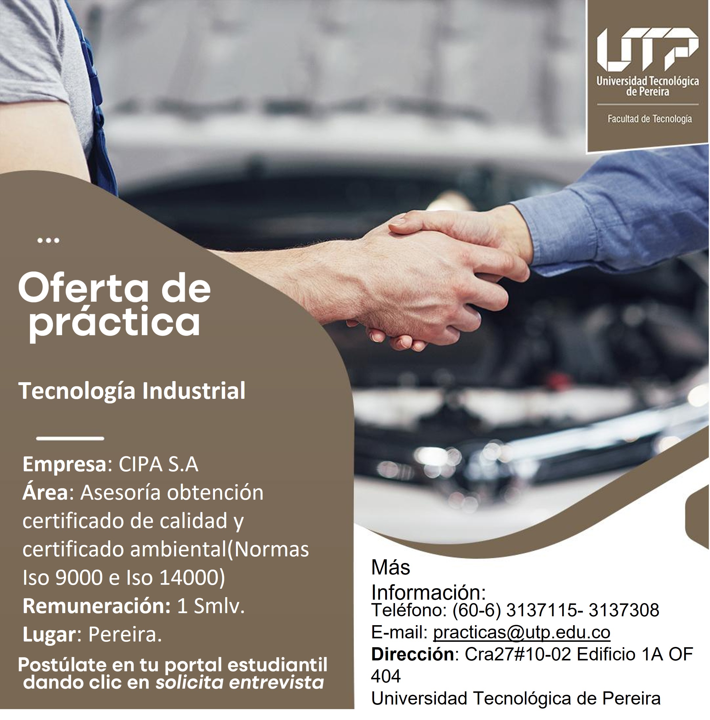 | Septiembre | PANORAMA S.A | PRÁCTICA PARA TECNÓLOGO INDUSTRIAL | TECNOLOGÍA INDUSTRIAL | Ver más | Ir a solicitar entrevista |