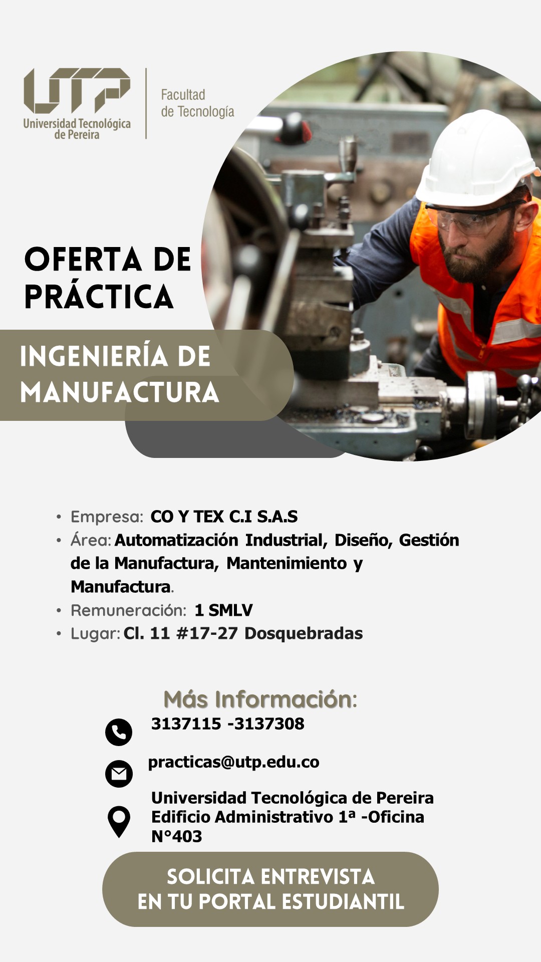 | Octubre | CO Y TEX C.I S.A.S | PRACTICANTE EN INGENIERIA DE MANUFACTURA | INGENIERIA DE MANUFACTURA | Ver más | Ir a solicitar entrevista |