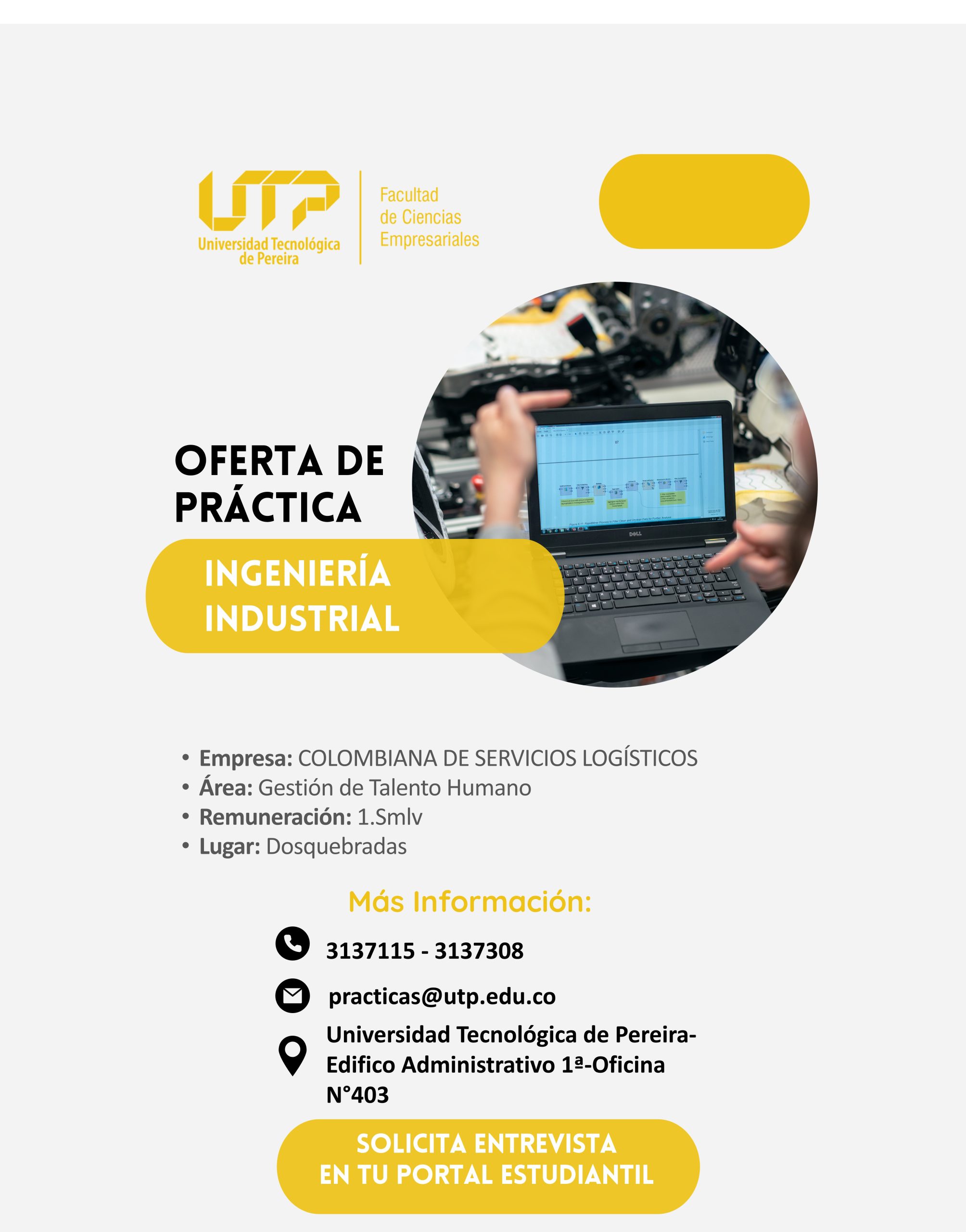 Enero | COLOMBIANA DE SERVICIOS LOGÍSTICOS | PRACTICANTE GESTION HUMANA | TECNOLOGIA INDUSTRIAL | Ver más | Ir a solicitar entrevista |