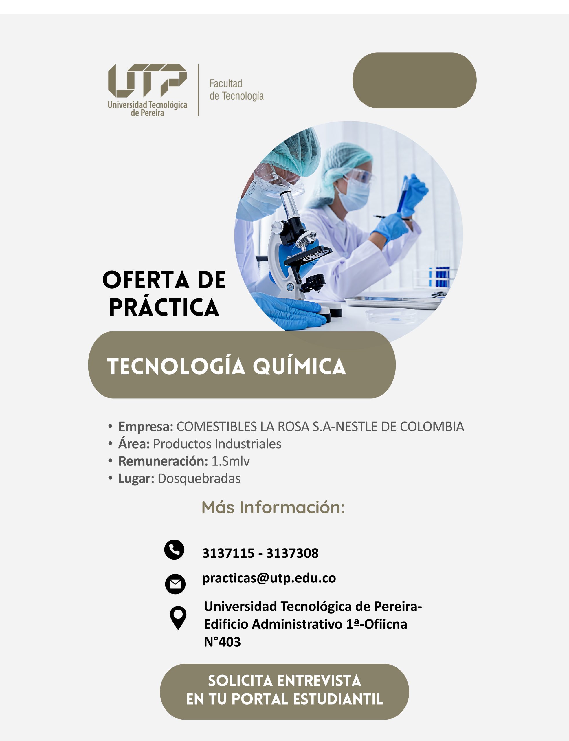 Septiembre | COMESTIBLES LA ROSA S.A – NESTLE DE COLOMBIA | CALIDAD/FISICOQUIMICO | TECNOLOGIA QUIMICA | Ver más | Ir a solicitar entrevista |