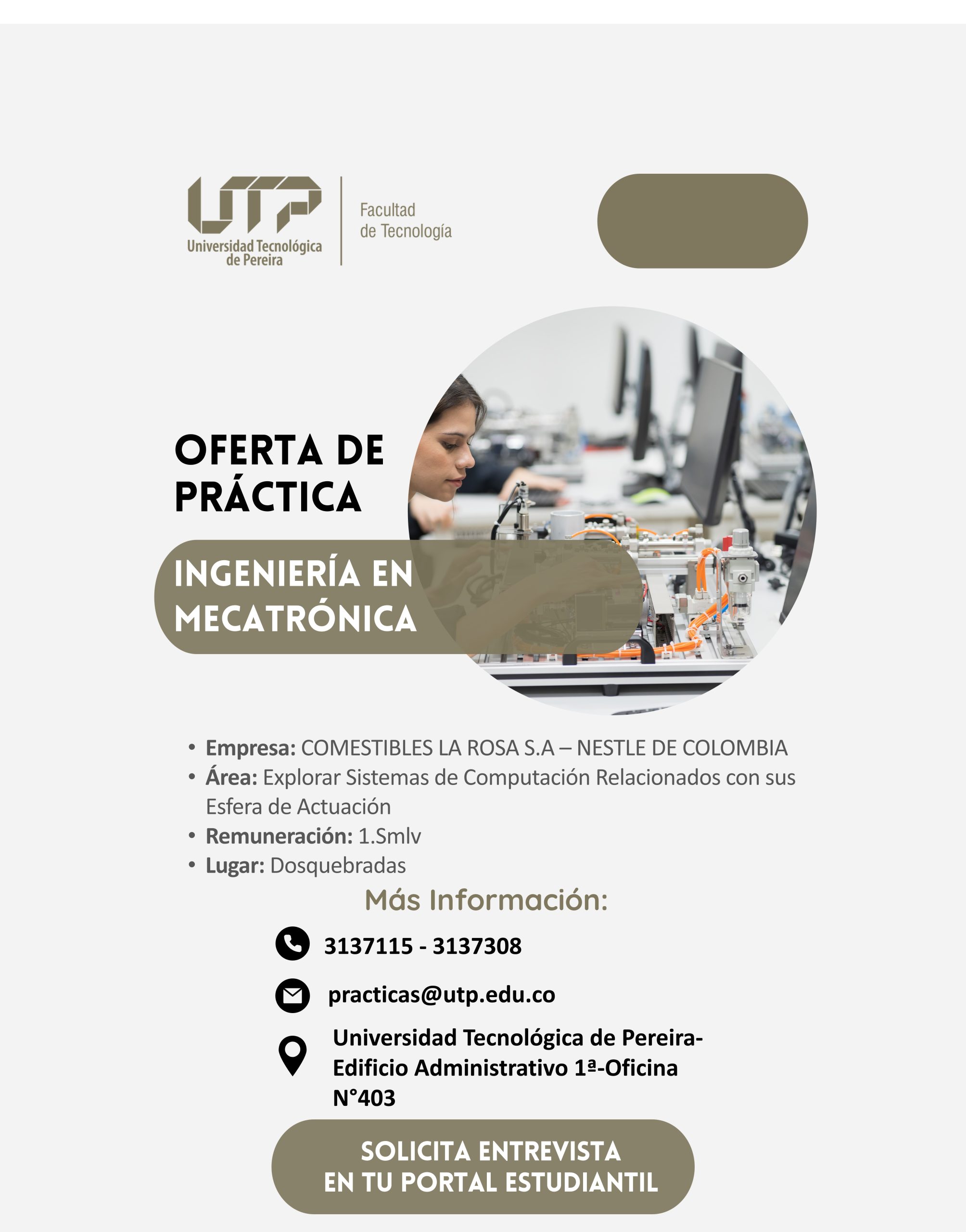 Agosto | COMESTIBLES LA ROSA S.A – NESTLE DE COLOMBIA | TECNICO | INGENIERÍA EN MECATRÓNICA- JORNADA ESPECIAL NOCTURNA(JE) | Ver más | Ir a solicitar entrevista |