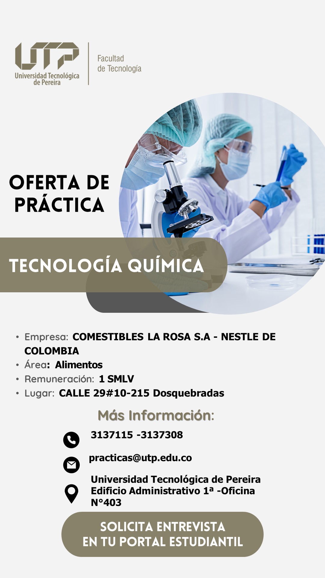 | Septiembre | COMESTIBLES LA ROSA S.A – NESTLE DE COLOMBIA | CALIDAD/FISICOQUIMICO | TECNOLOGIA QUIMICA | Ver más | Ir a solicitar entrevista |