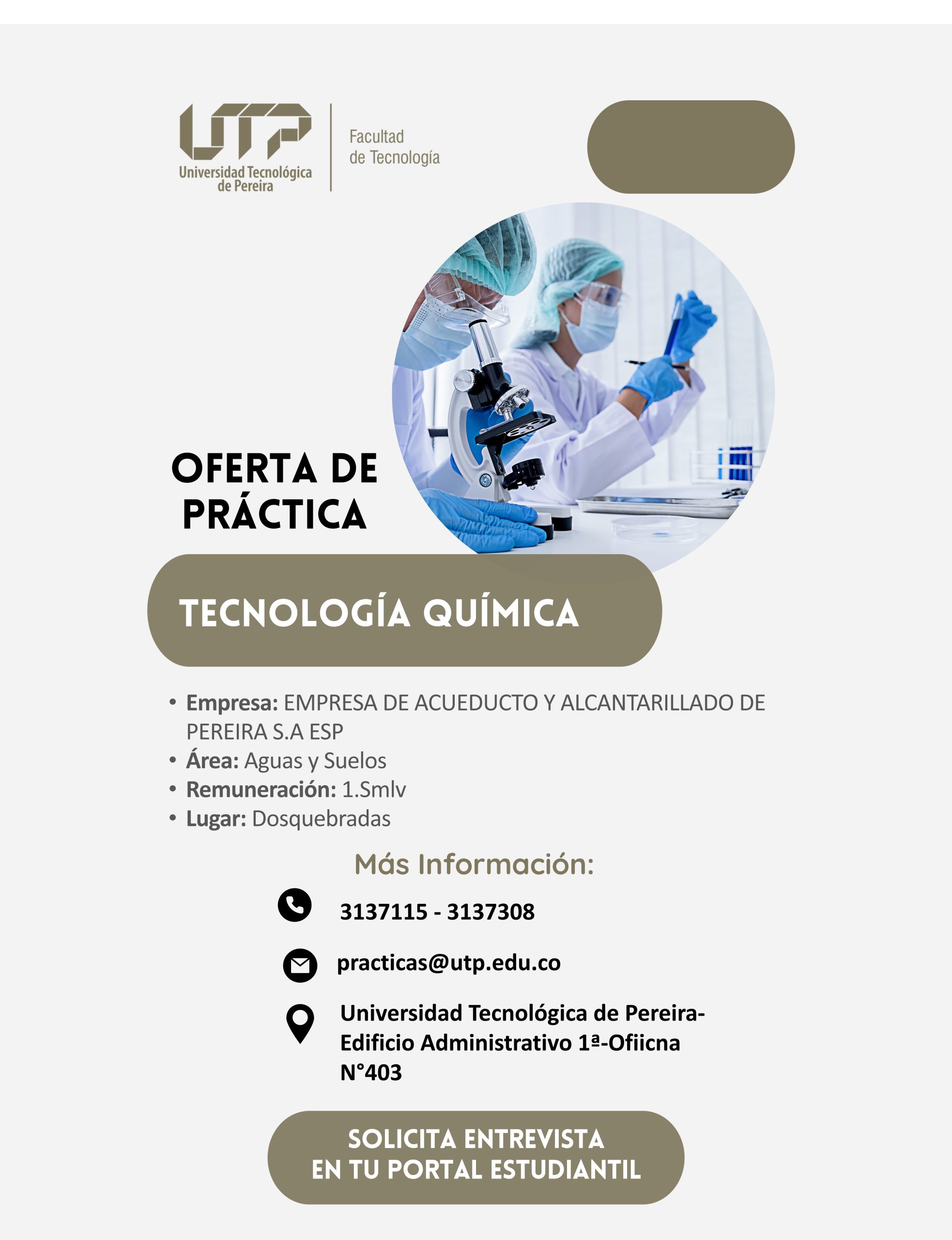 Septiembre | EMPRESA DE ACUEDUCTO Y ALCANTARILLADO DE PEREIRA S.A ESP | TECNOLOGOS QUIMICOS | TECNOLOGIA QUIMICA | Ver más | Ir a solicitar entrevista |