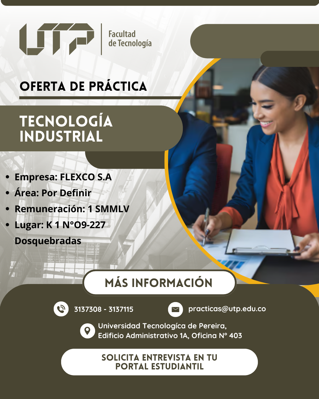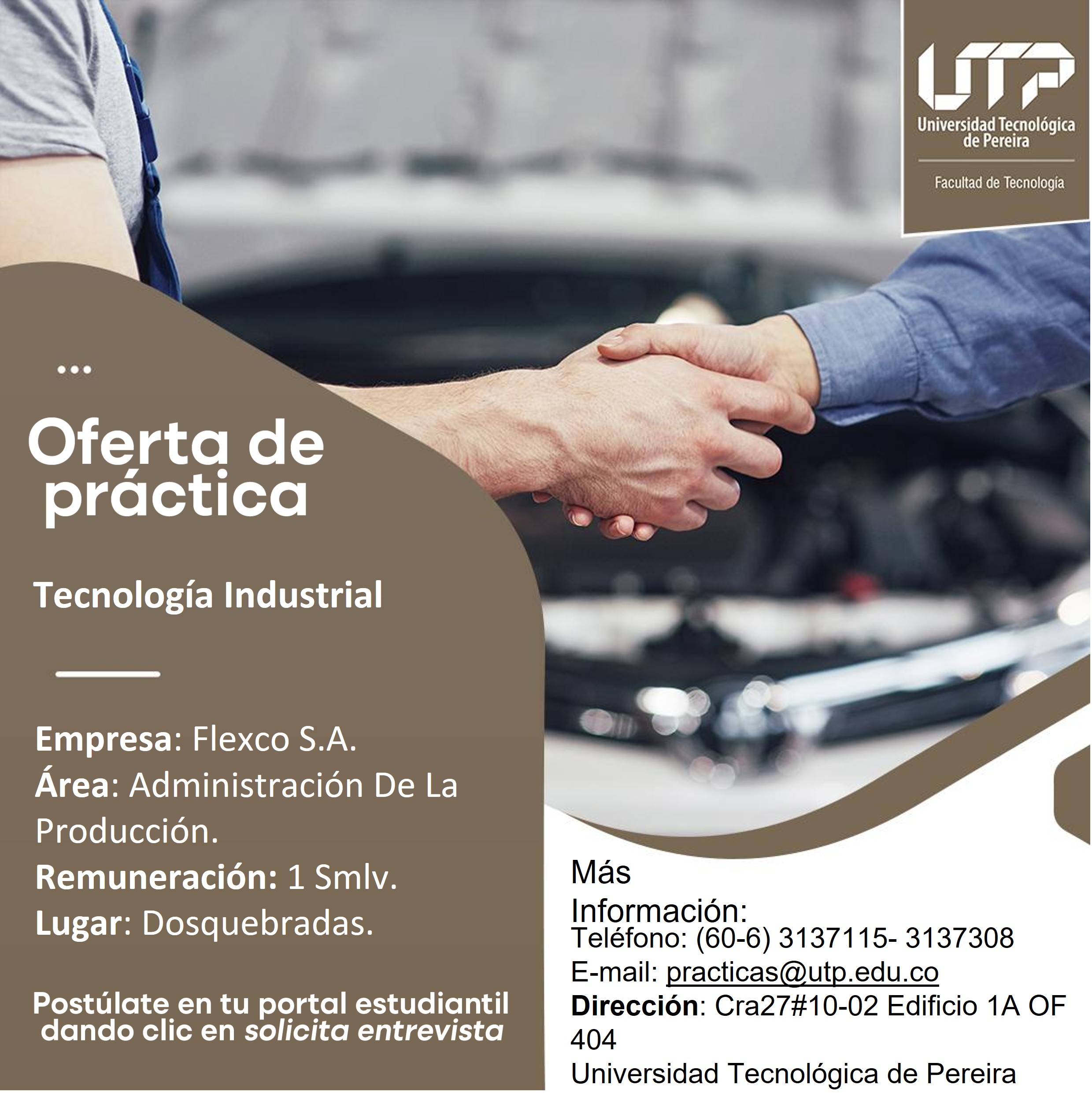 | Octubre | FLEXCO S.A | PRACTICANTE TECNOLOGO INDUSTRIAL | TECNOLOGÍA INDUSTRIAL | Ver más | Ir a solicitar entrevista |