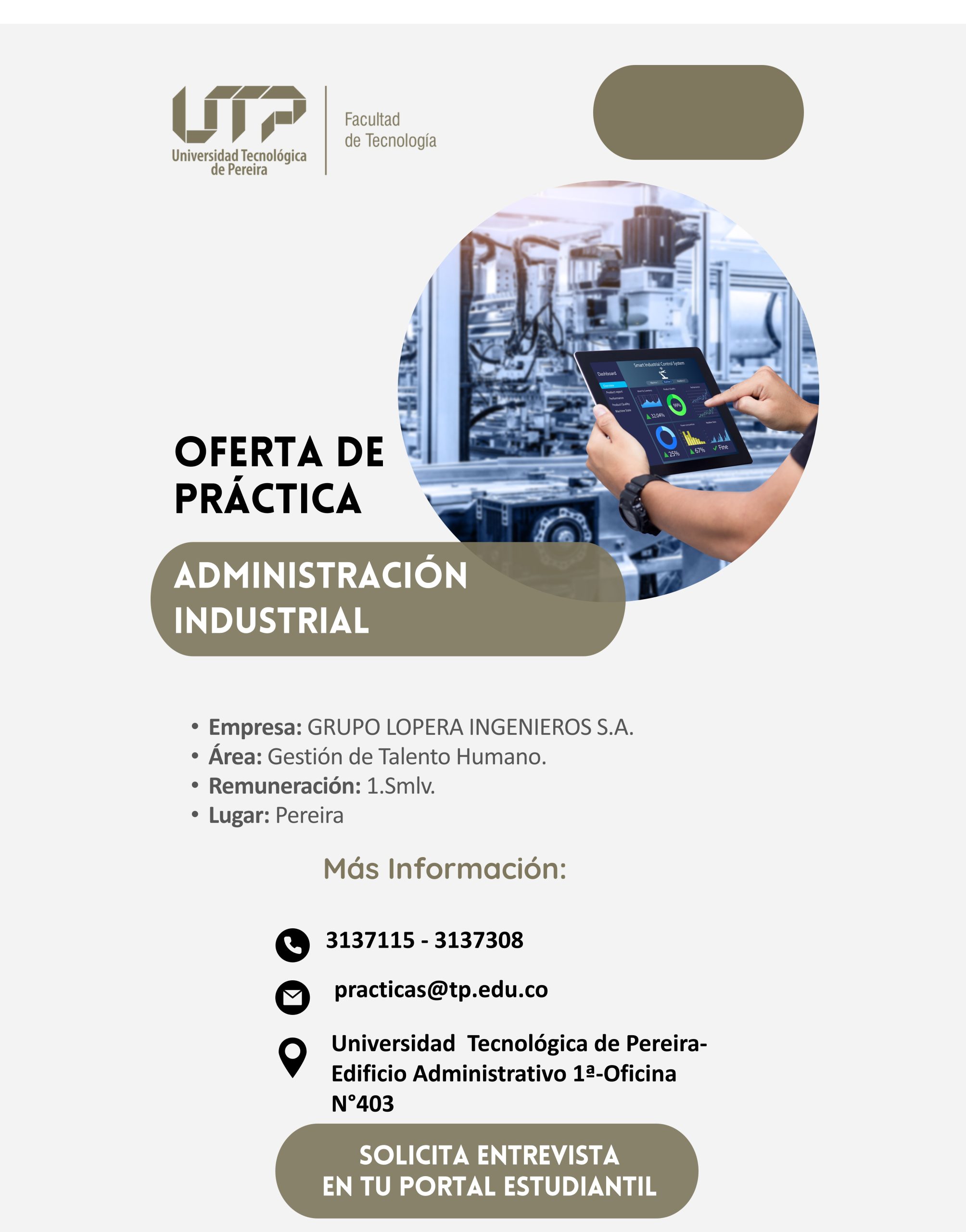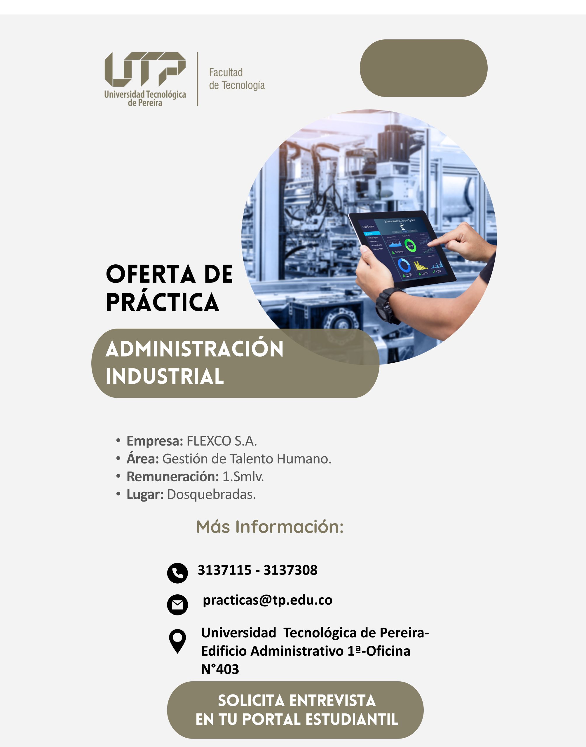 | Enero | UNIVERSIDAD TECNOLOGICA DE PEREIRA | PRACTICANTE LABORATORIOS FACULTAD BELLAS ARTES – ING. INDUSTRIAL | INGENIERIA INDUSTRIAL | Ver más | Ir a solicitar entrevista |