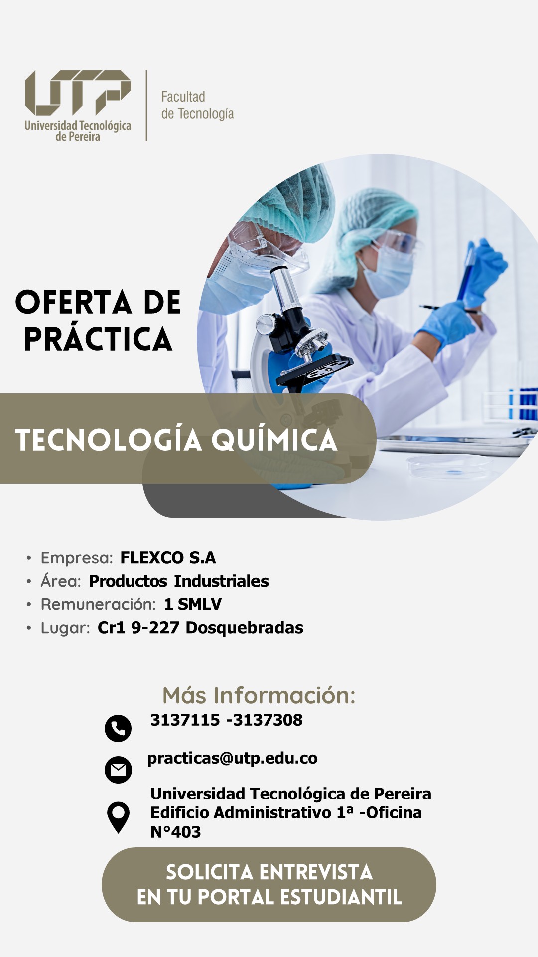 | Octubre | FLEXCO S.A | PRACTICANTE TECNOLOGO QUIMICO | TECNOLOGÍA QUÍMICA | Ver más | Ir a solicitar entrevista |