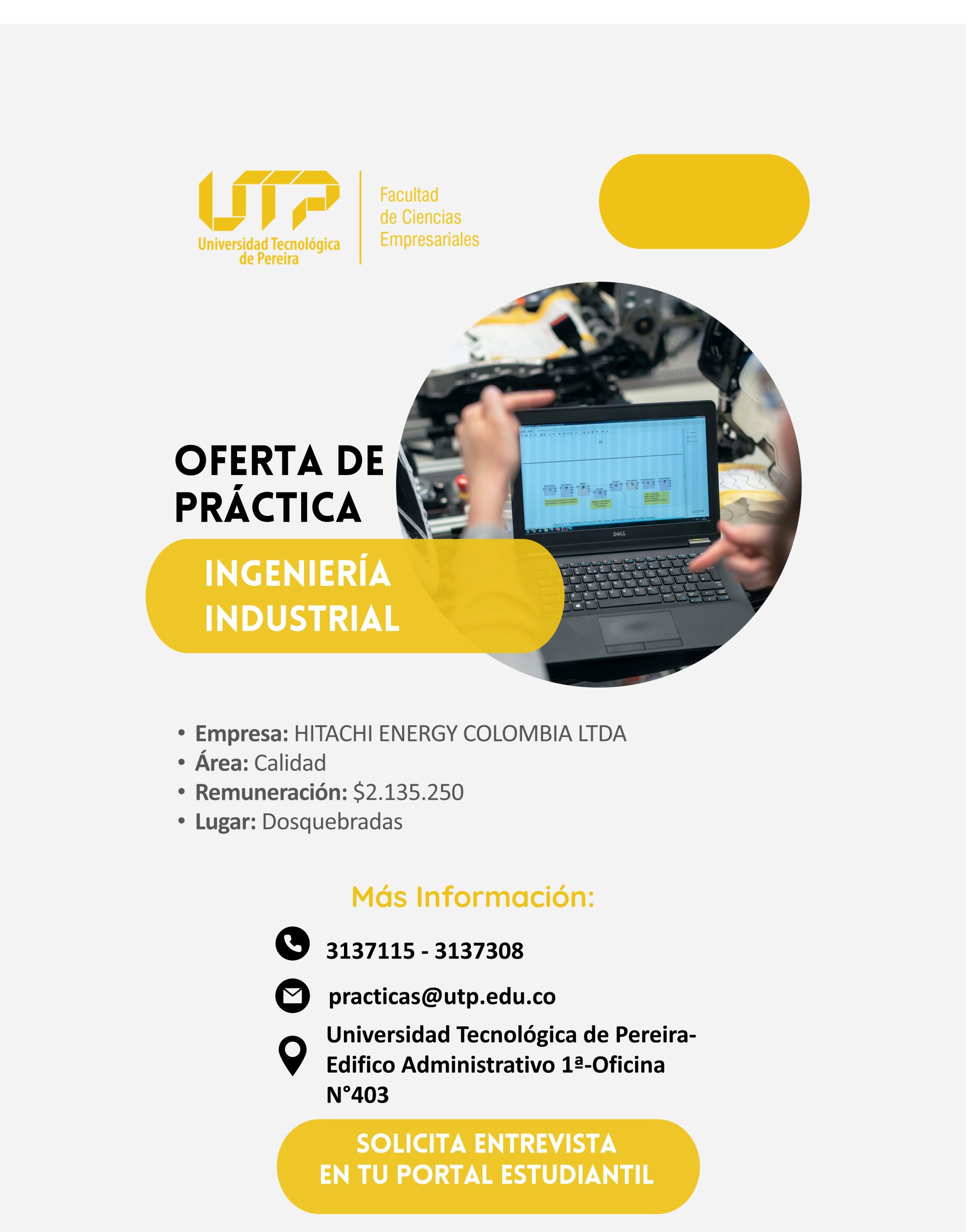 Septiembre | HITACHI ENERGY COLOMBIA LTDA | HITACHI ENERGY – PRACTICANTE DE CALIDAD (R0098502 ING INDUSTRIAL) | INGENIERIA INDUSTRIAL | Ver más | Ir a solicitar entrevista |
