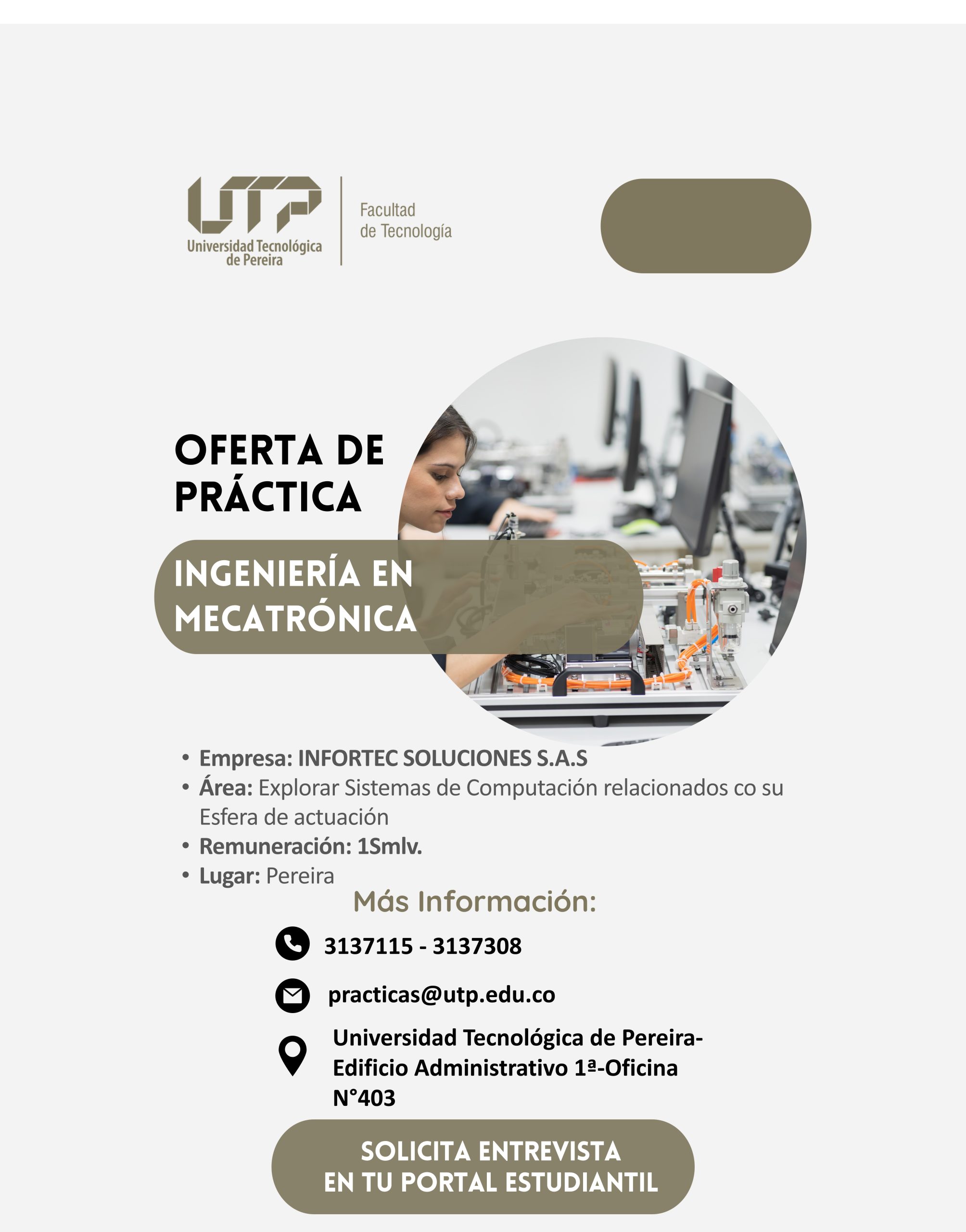 Agosto | INFORTEC SOLUCIONES S.A.S | PRACTICANTE INGENIERIA | INGENIERIA EN MECATRONICA – CICLO II TECNOLOGIA EN MECATRONICA | Ver más | Ir a solicitar entrevista |