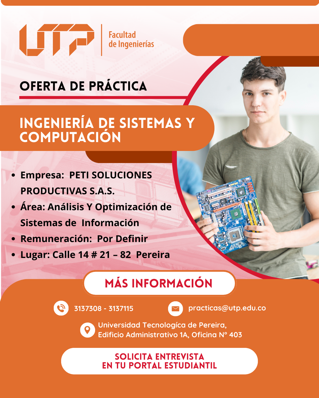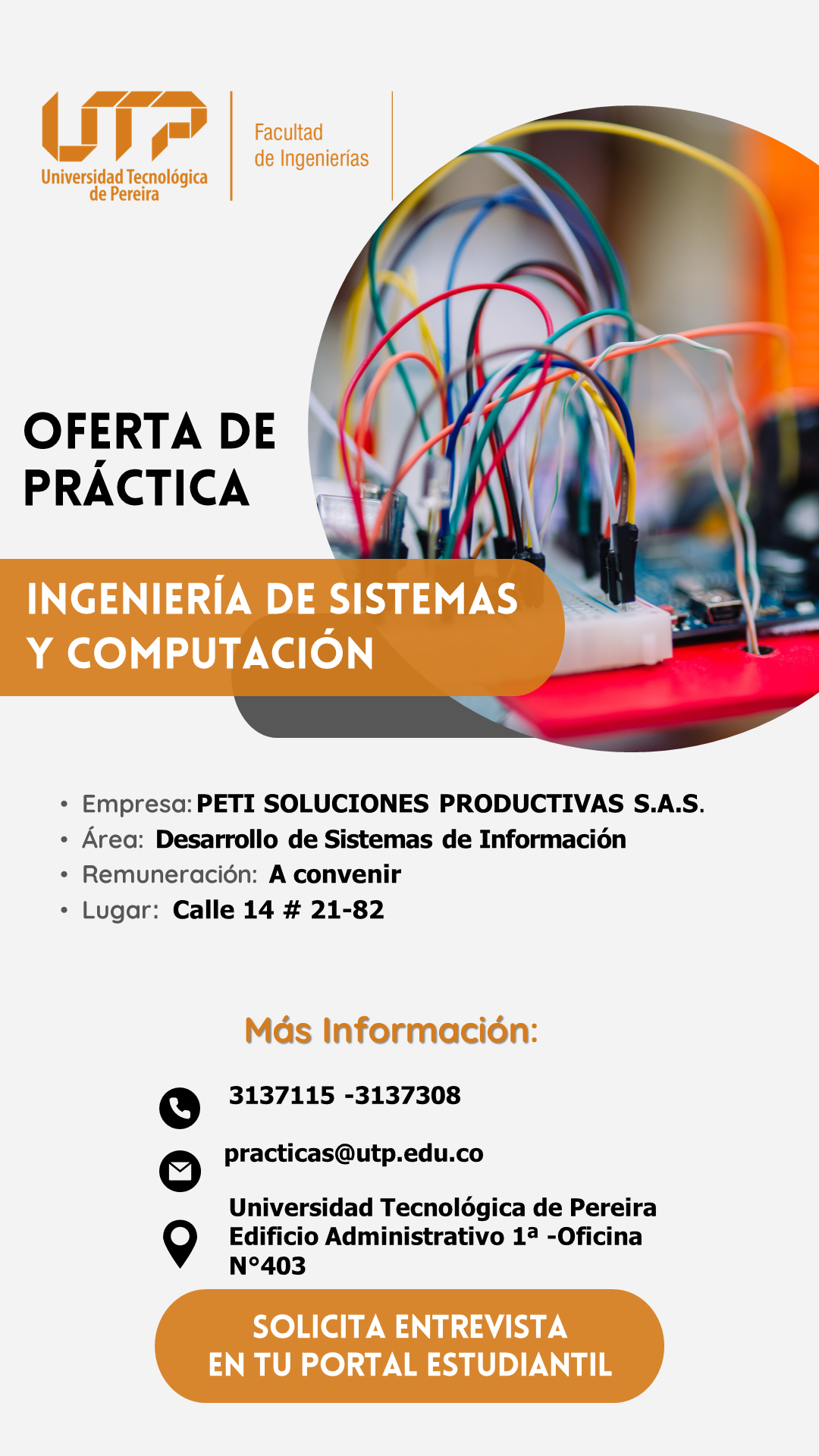 | Noviembre | PETI SOLUCIONES PRODUCTIVAS S.A.S. | PRACTICANTE EN INGENIERIA DE SISTEMAS | INGENIERÍA DE SISTEMAS Y COMPUTACIÓN | Ver más | Ir a solicitar entrevista |
