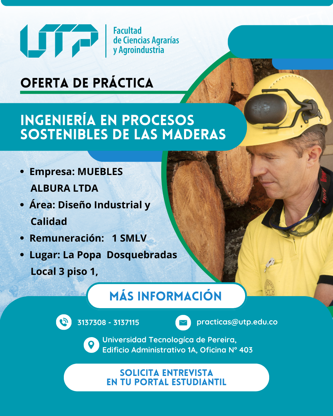| Octubre | MUEBLES ALBURA LTDA | APOYAR EL ÁREA DE DISEÑO INDUSTRIAL Y CALIDAD | INGENIERÍA EN PROCESOS SOSTENIBLES DE LAS MADERAS | Ver más | Ir a solicitar entrevista |