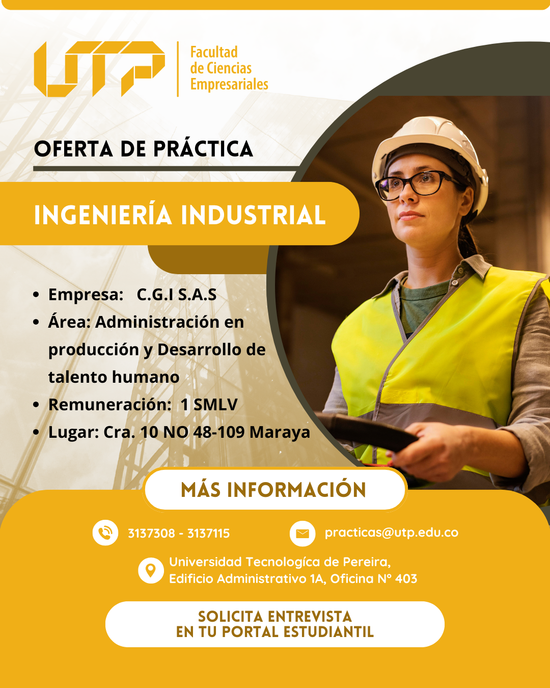 | Octubre | C.G.I S.A.S | PRACTICANTE INGENIERÍA INDUSTRIAL | INGENIERÍA INDUSTRIAL | Ver más | Ir a solicitar entrevista |