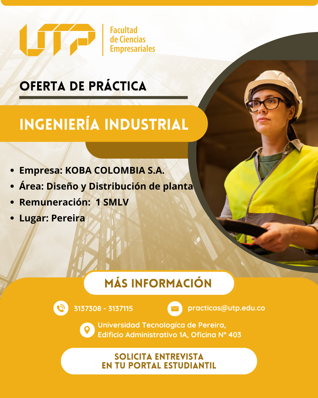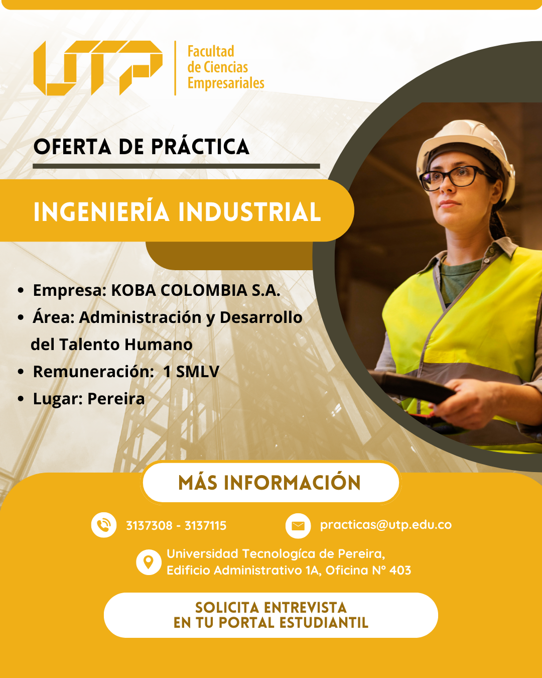 | Noviembre | KOBA COLOMBIA S.A.S | PRACTICANTES AREA DE MANTENIMIENTO | INGENIERÍA INDUSTRIAL | Ver más | Ir a solicitar entrevista |