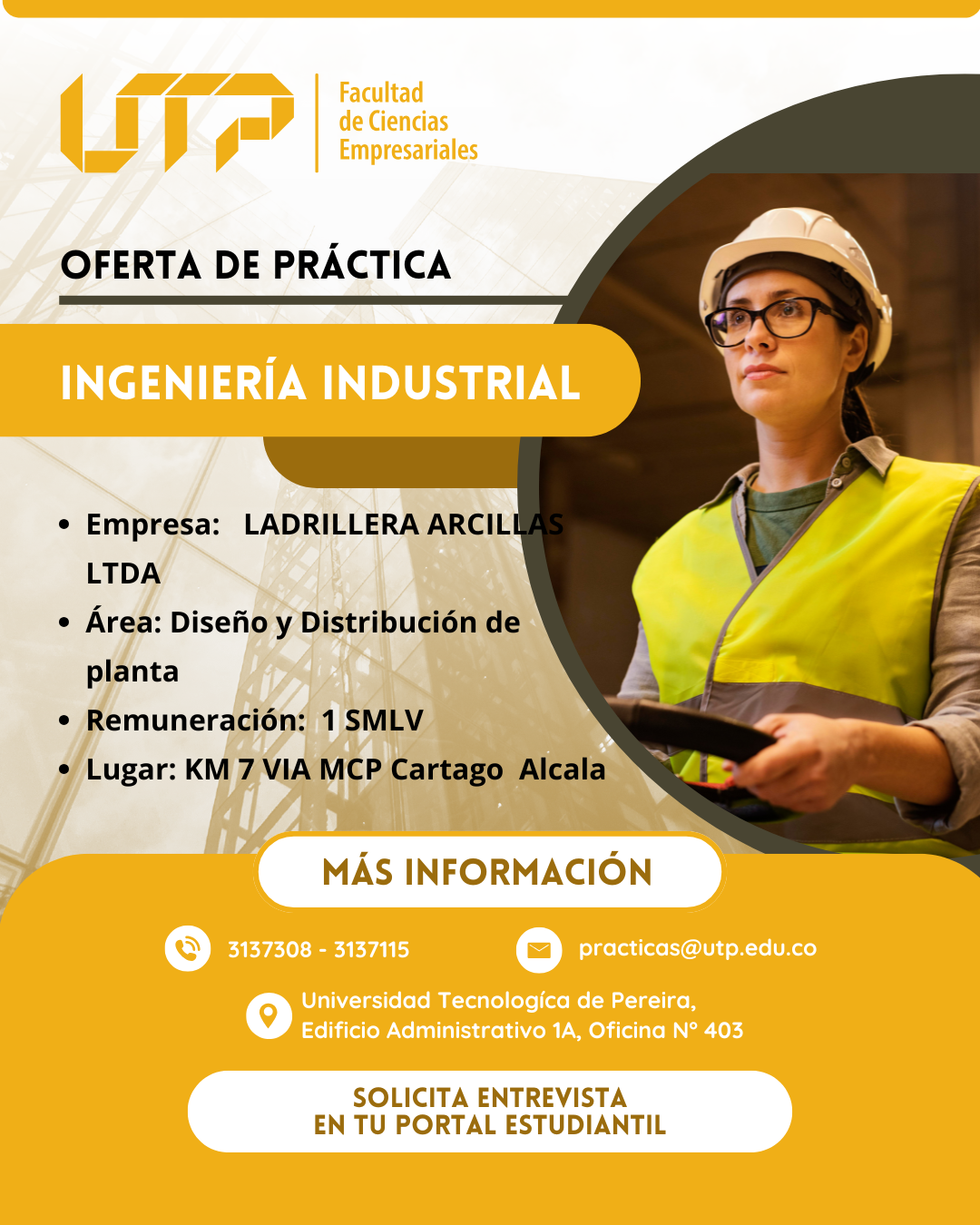| Octubre | LADRILLERA ARCILLAS LTDA | PRACTICANTE DE INGENIERÍA INDUSTRIAL | INGENIERÍA INDUSTRIAL | Ver más | Ir a solicitar entrevista |