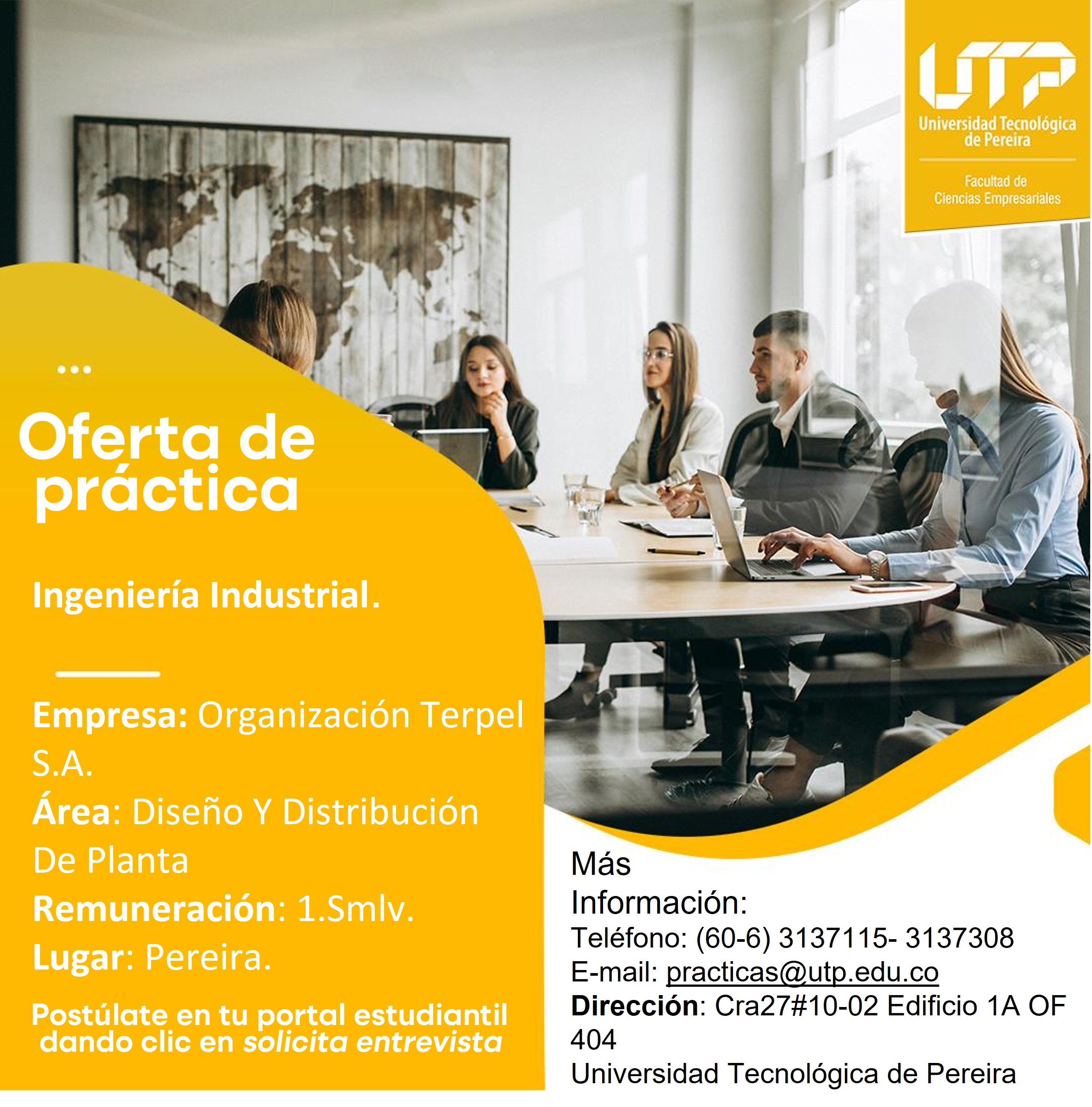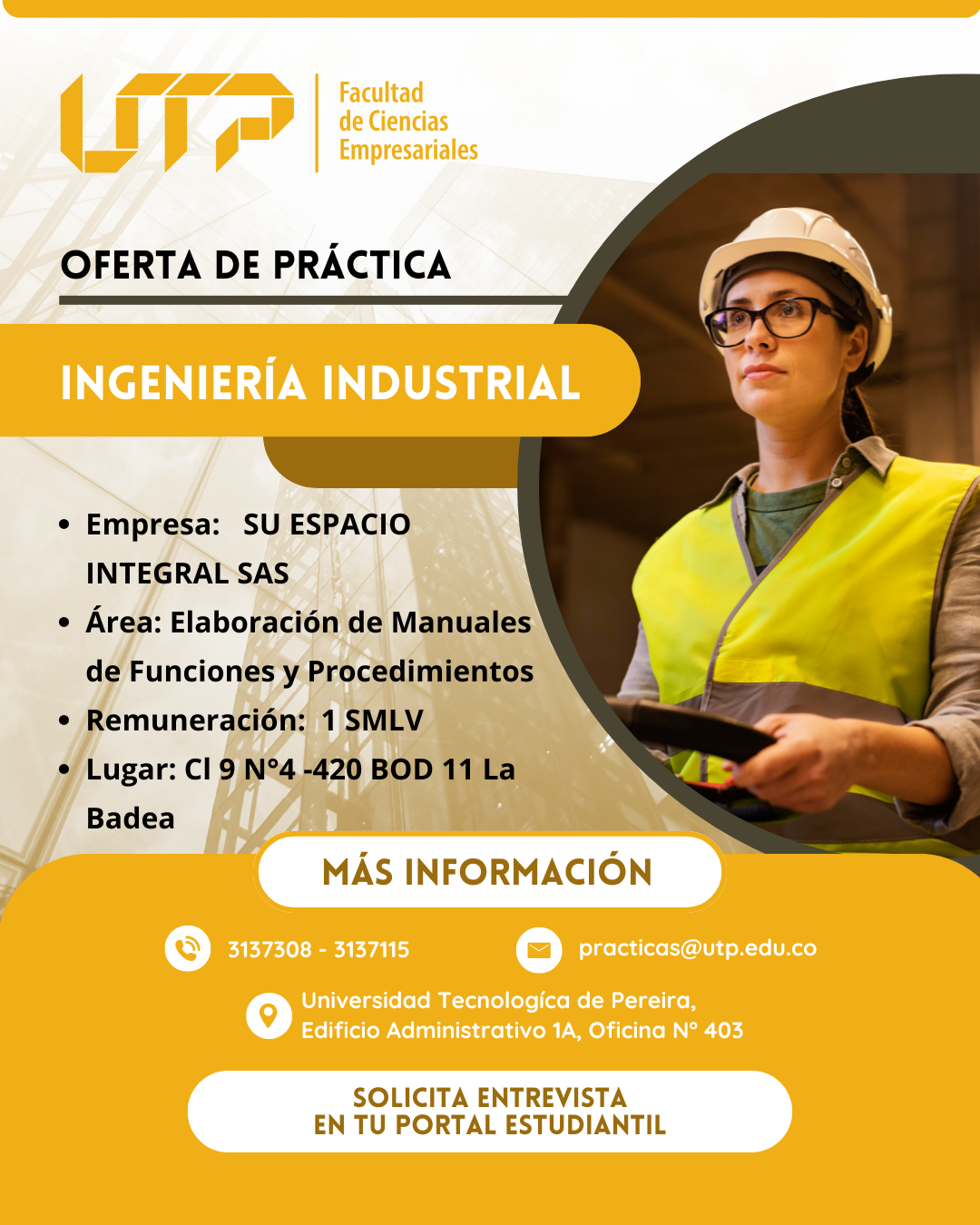 | Octubre | SU ESPACIO INTEGRAL SAS | PRACTICANTE DE INGENIERÍA INDUSTRIAL | INGENIERÍA INDUSTRIAL | Ver más | Ir a solicitar entrevista |