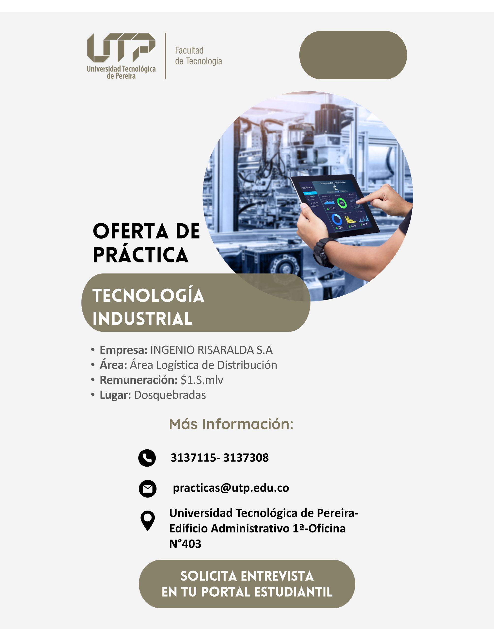 Septiembre | INGENIO RISARALDA S.A | PRACTICANTE – ÁREA LODÍSTICA DE DISTRIBUCIÓN | TECNOLOGIA INDUSTRIAL | Ver más | Ir a solicitar entrevista |