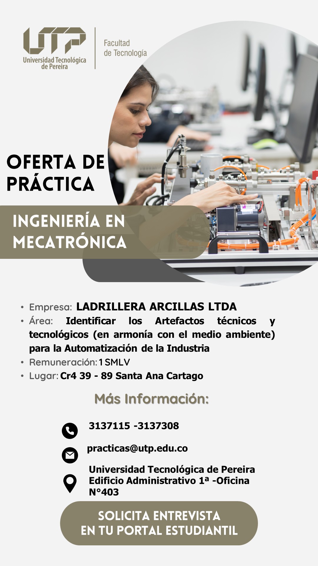 | Octubre | LADRILLERA ARCILLAS LTDA | INGENIERO MECATRONICO | INGENIERÍA EN MECATRÓNICA- JORNADA ESPECIAL NOCTURNA(JE) | Ver más | Ir a solicitar entrevista |