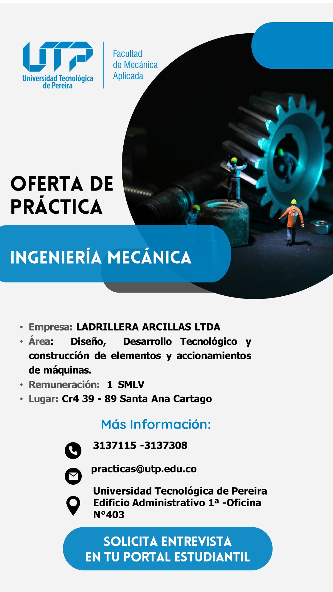 | Octubre | LADRILLERA ARCILLAS LTDA | PRACTICANTE EN INGENIERIA MECANICA | INGENIERIA MECANICA | Ver más | Ir a solicitar entrevista |