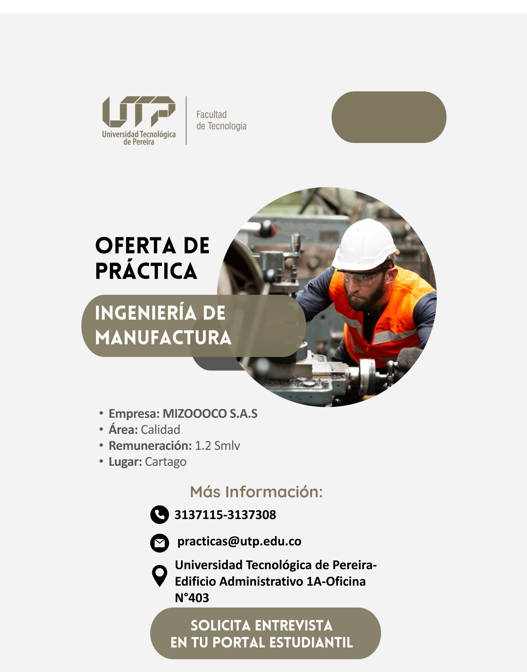 Septiembre | MIZOOCO S.A.S | PRACTICANTE DE CALIDAD | INGENIERIA DE MANUFACTURA | Ver más | Ir a solicitar entrevista |