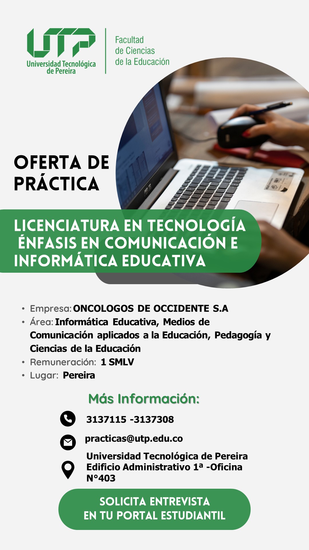 | Octubre | ONCOLOGOS DE OCCIDENTE S.A | PRACTICANTE EN COMUNICACIONES | LICENCIATURA EN TECNOLOGÍA CON ÉNFASIS EN COMINICACIÓN | Ver más | Ir a solicitar entrevista |
