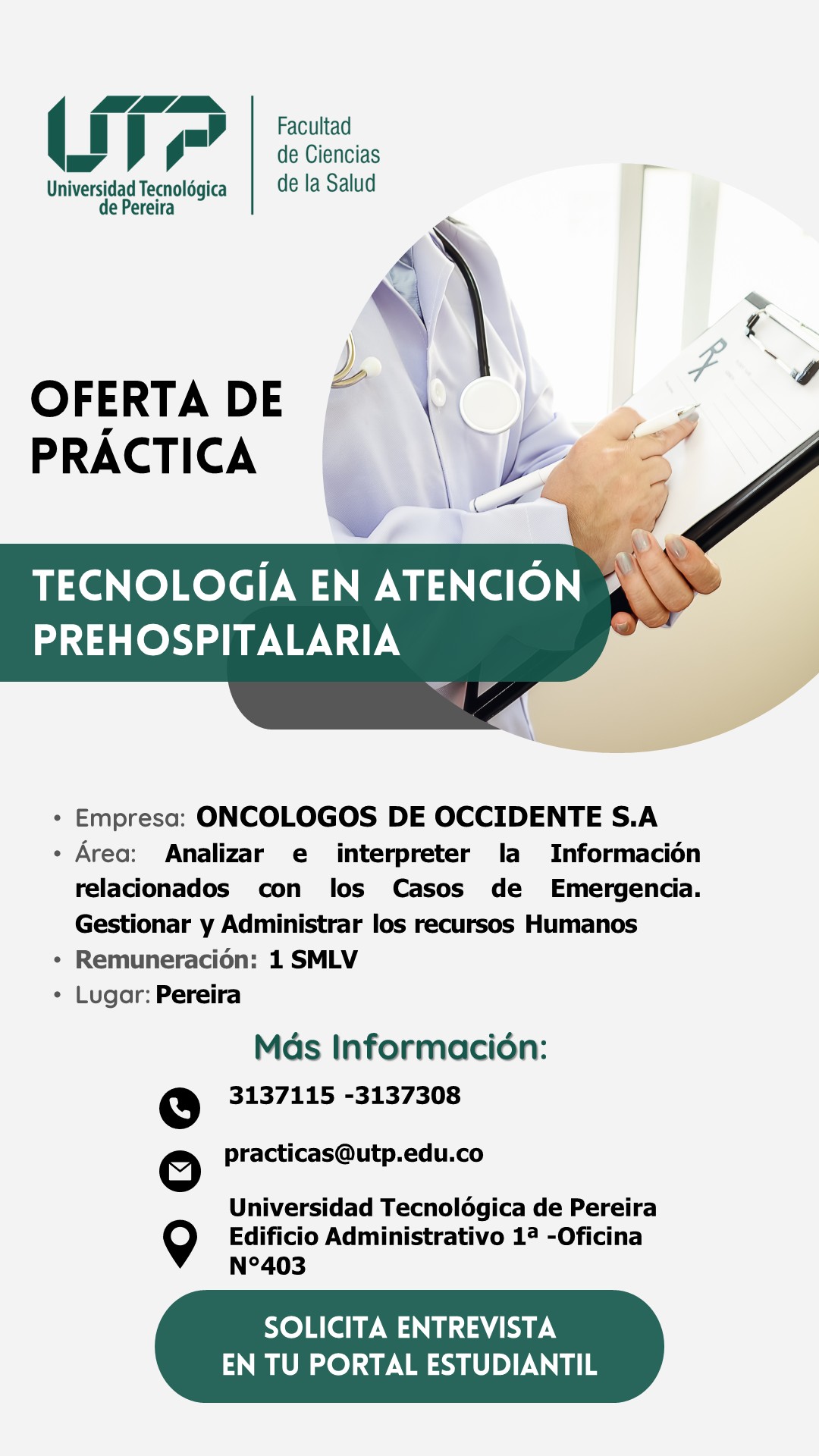 | Octubre | ONCOLOGOS DE OCCIDENTE S.A | PRACTICANTE TECNOLOGÍA EN ATENCIÓN PREHOSPITALARIA | TECNOLOGÍA EN ATENCIÓN PREHOSPITALARIA | Ver más | Ir a solicitar entrevista |