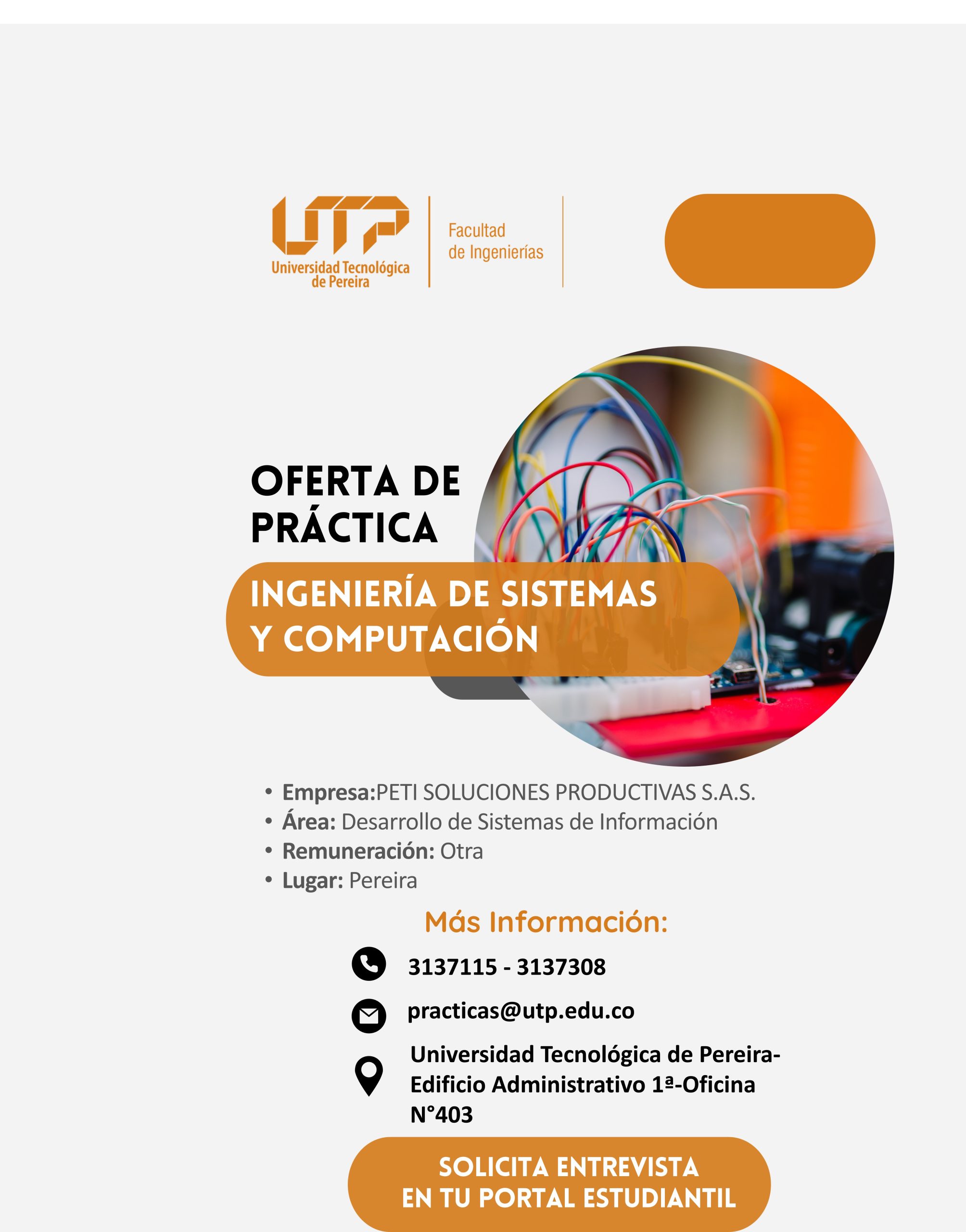 Septiembre | PETI SOLUCIONES PRODUCTIVAS S.A.S. | PRACTICANTE EN INGENIERIA DE SISTEMAS | INGENIERIA DE SISTEMAS Y COMPUTACION | Ver más | Ir a solicitar entrevista |