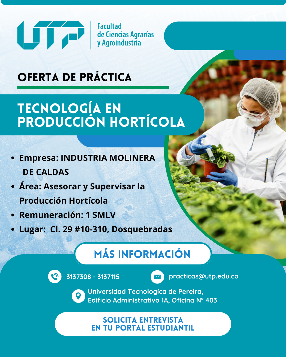 | Noviembre | INDUSTRIA MOLINERA DE CALDAS | PRACTICANTE DE CALIDAD | TECNOLOGÍA EN PRODUCCIÓN HORTÍCOLA | Ver más | Ir a solicitar entrevista |