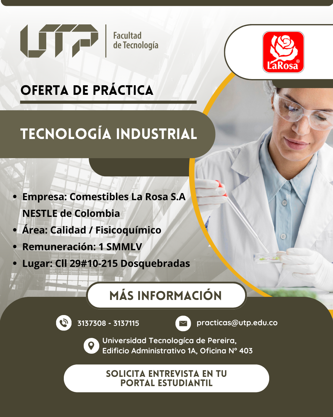 Septiembre | COMESTIBLES LA ROSA S.A – NESTLE DE COLOMBIA | CALIDAD/FISICOQUIMICO | TECNOLOGÍA INDUSTRIAL | Ver más | Ir a solicitar entrevista |