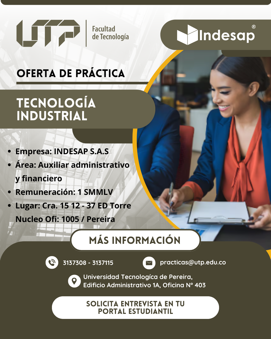 | Noviembre | INDESAP S.A.S. | AUXILIAR ADMINISTRATIVO Y FINANCIERO | TECNOLOGÍA INDUSTRIAL | Ver más | Ir a solicitar entrevista |