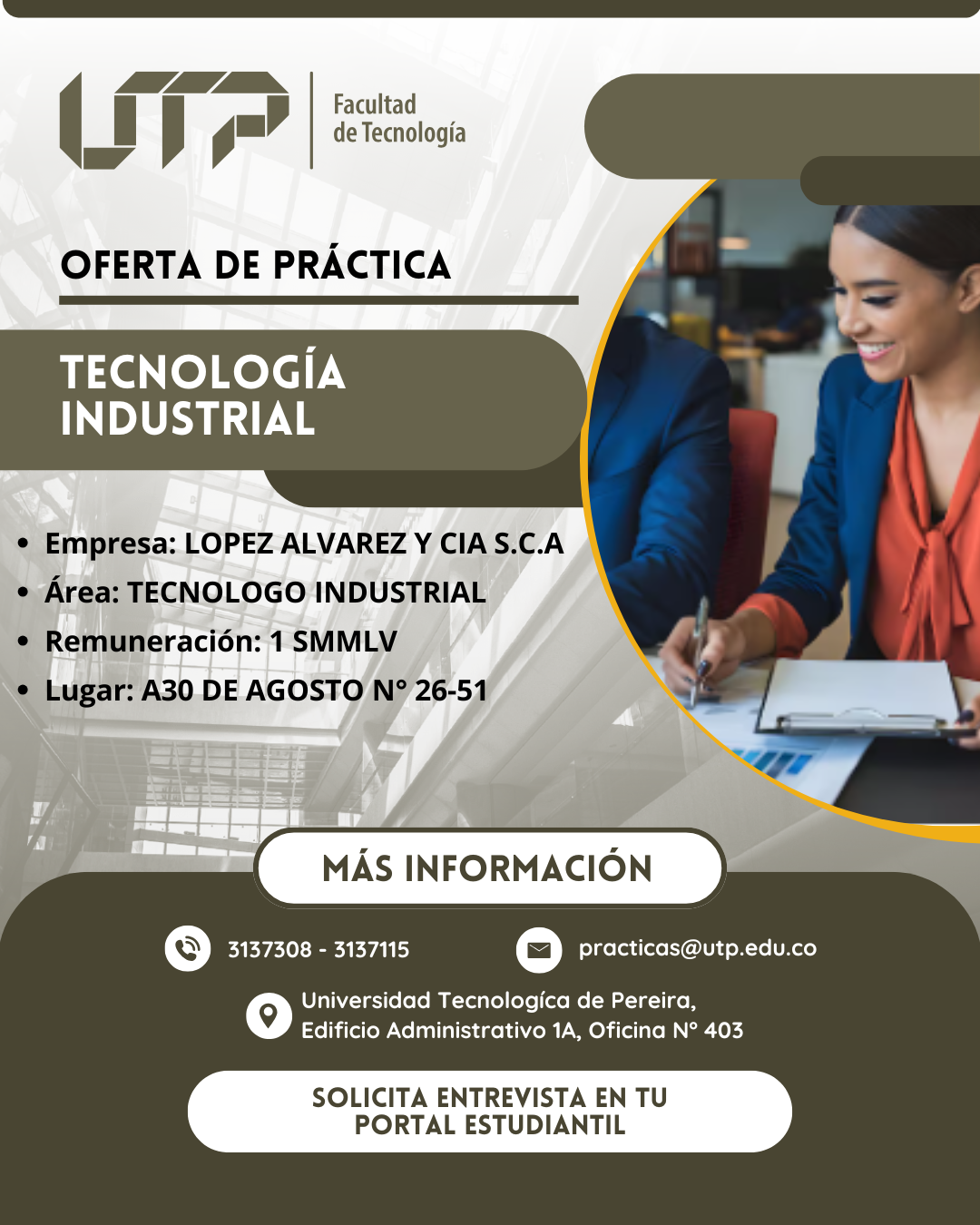 | Noviembre | LOPEZ ALVAREZ Y CIA S.C.A | PRACTICANTE EN TECNOLOGÍA INDUSTRIAL | TECNOLOGÍA INDUSTRIAL | Ver más | Ir a solicitar entrevista |