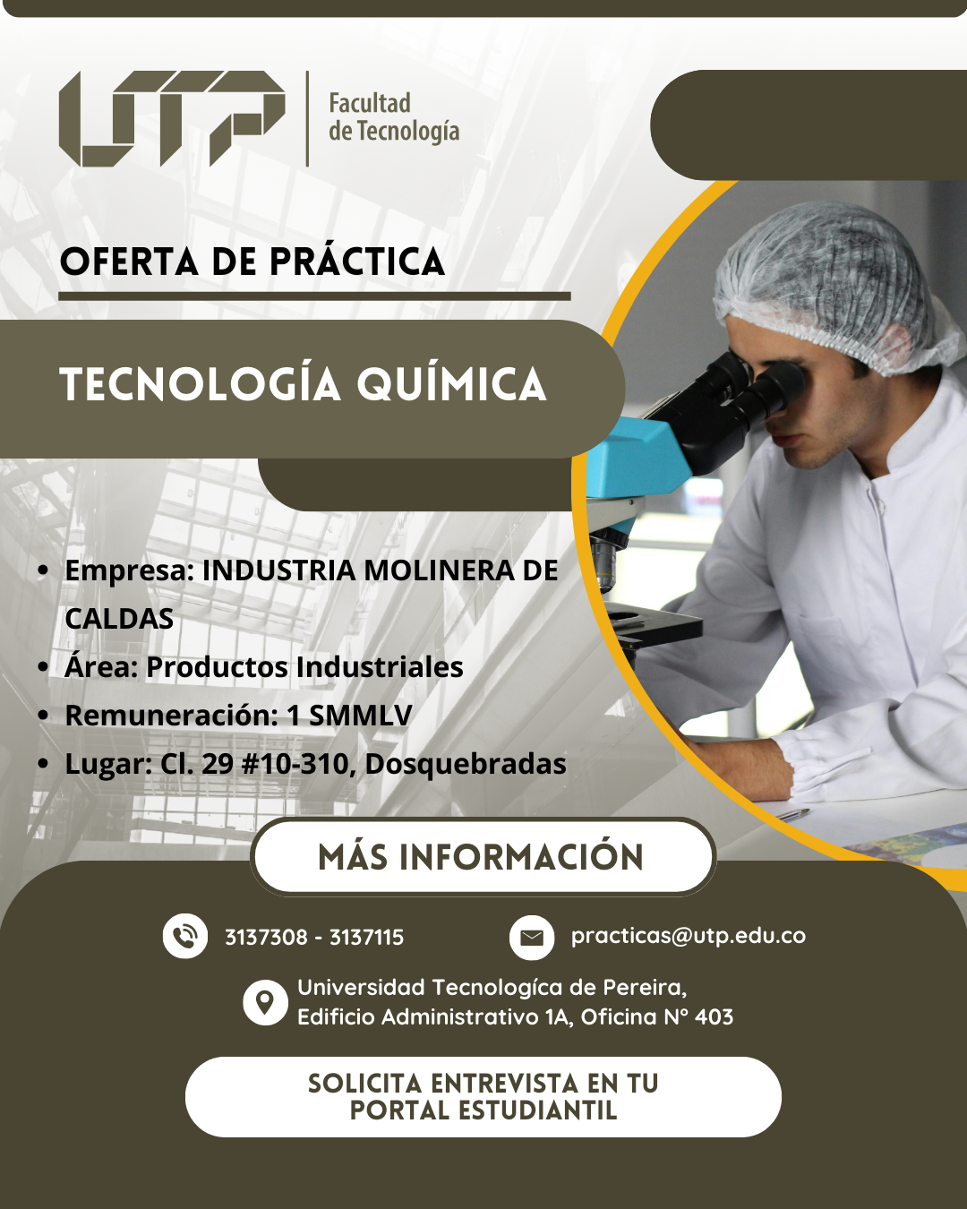 | Noviembre | INDUSTRIA MOLINERA DE CALDAS | PRACTICANTE DE CALIDAD | TECNOLOGÍA QUÍMICA | Ver más | Ir a solicitar entrevista |